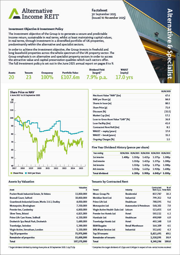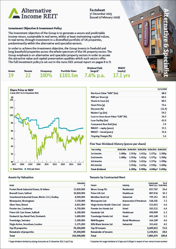 Alternative Income REIT PLC aims to offer investors a secure, diversified and inflation-linked income return, whilst at least maintaining capital values in real terms, through exposure to alternative and specialist real estate sectors such as automotive & petroleum, education, healthcare, hotels and industrials.